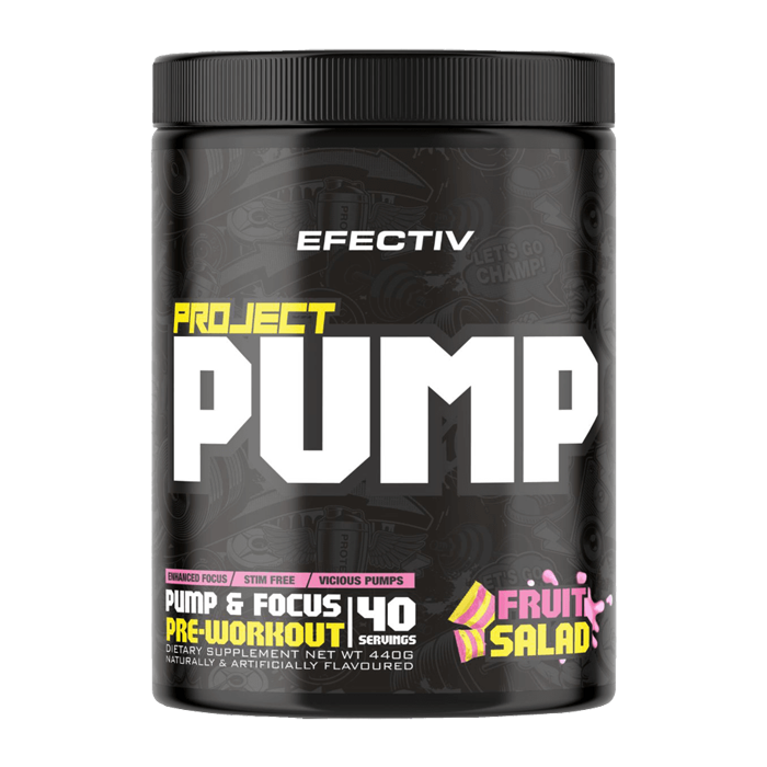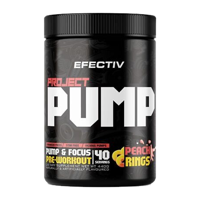 EFECTIV Project Pump is a stimulant free pre-workout designed to support increased blood flow, endurance, cognitive performance, and combat stress during intense training sessions.